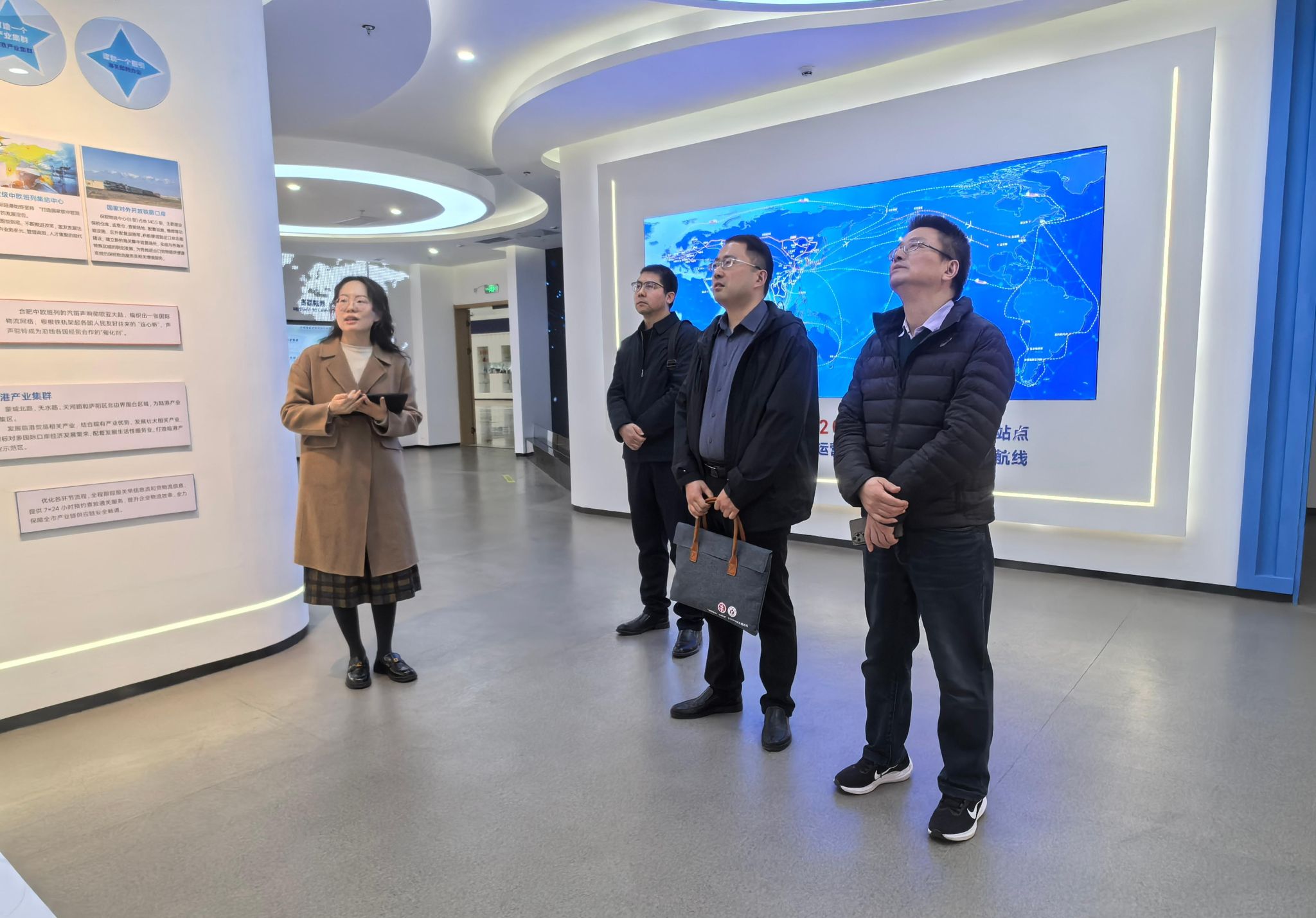 在合肥国际内陆港发展有限公司董事长陈锋及相关负责人陪同下,学院一行参观了企业展示中心,系统了解了企业发展历程、核心业务布局、运营模式及数字化管理实践成果。