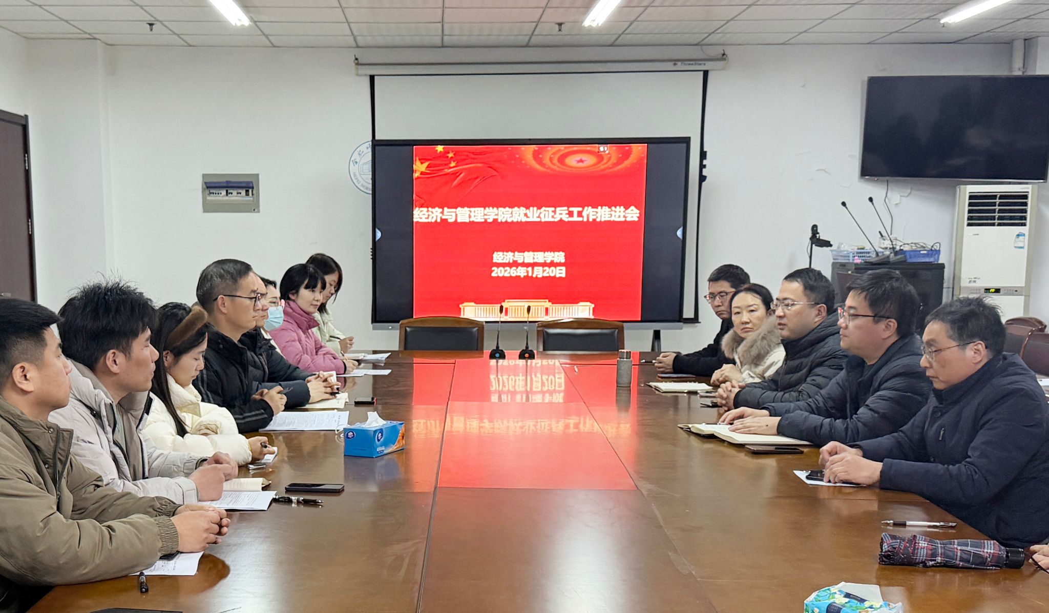 为深入贯彻落实省教育厅关于高校毕业生就业工作的决策部署及征兵工作要求,压实工作责任,赋能学生成长,1月20日,经济与管理学院在行知楼902办公室召开就业征兵工作推进会。学院党政主要领导、全体学生工作成员参加会议,会议由学院党委副书记陶敏主持。