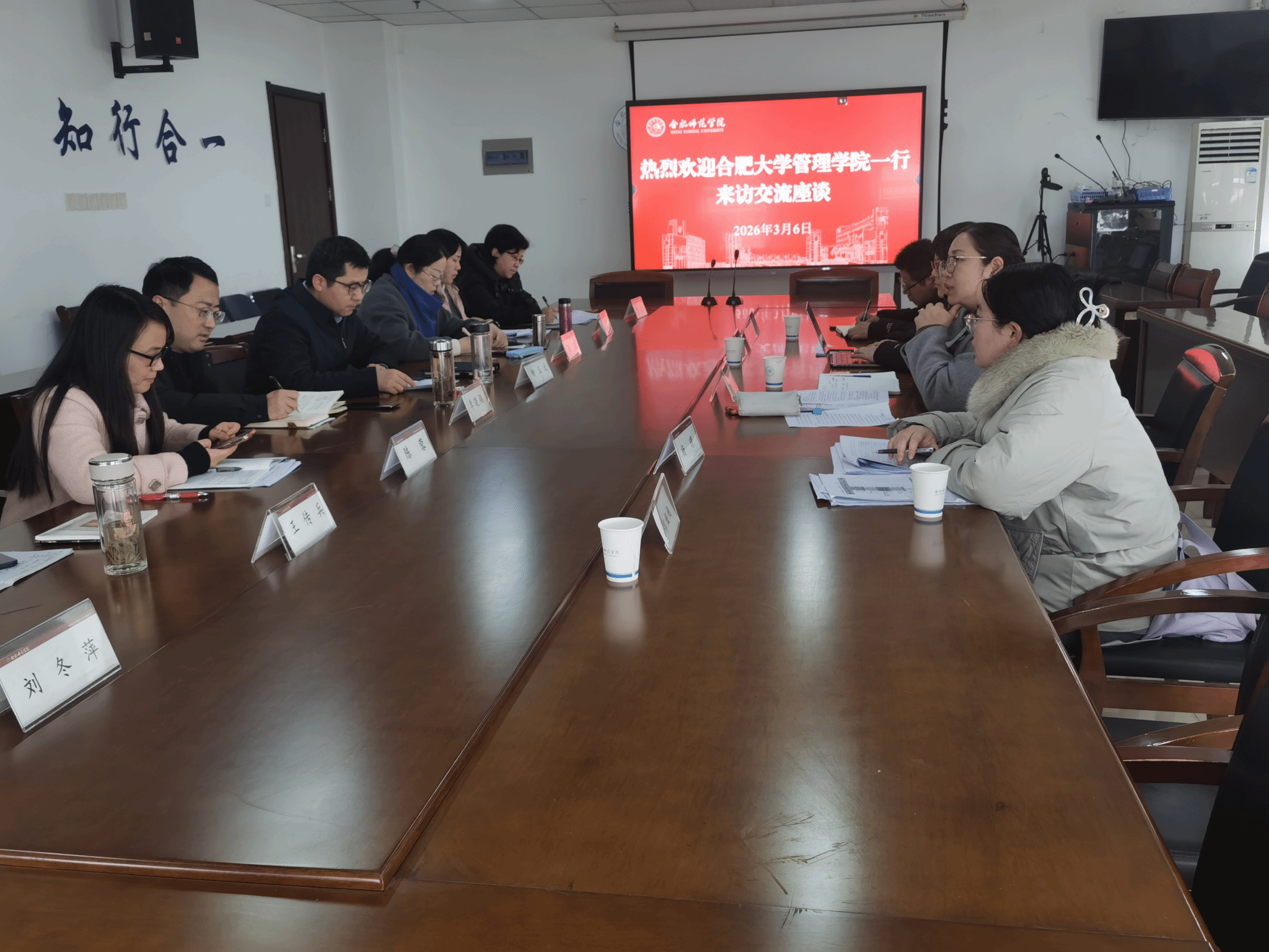 3月6日下午,合肥大学管理学院副院长吴悦一行就本科专业人才培养方案修订工作来我院开展专题调研交流。座谈会在学院会议室902举行,我院李晓翔院长、钟玉文副院长及相关专业负责人参加了交流。